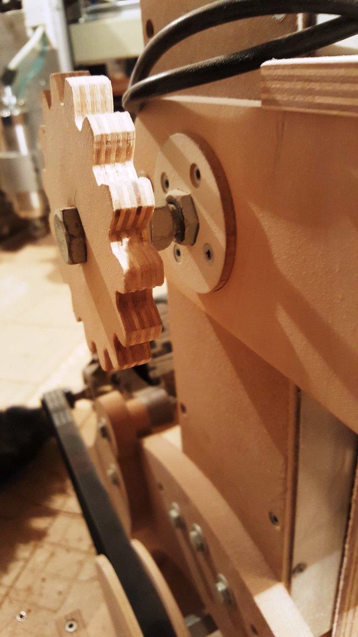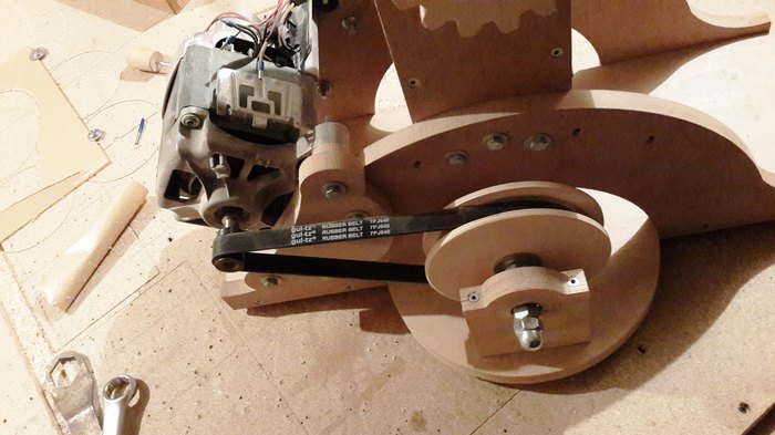 При сборке обратите внимание на качающуюся деталь с роликом — она служит для балансировки ленты. Небольшой винт-барашек позволяет отрегулировать наклон ленты при движении таким образом, чтобы не возникал бы эффект сваливания. Что же касается натяжения самой ленты, то сила, с которой ролик оттягивает ленту в рабочее положение регулируется с помощью небольшого винта с пружиной.