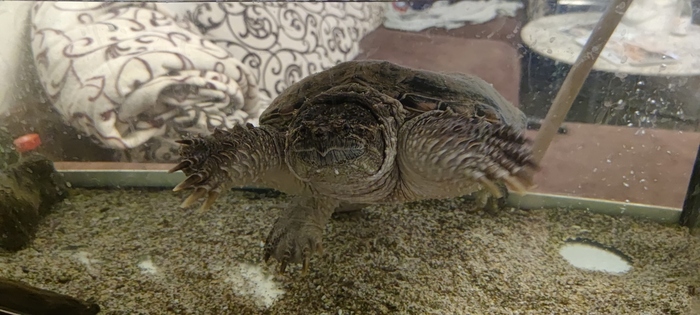 У меня живёт Грифовая черепаха (черепан), это как Каймановая, но ещё ебанутей и агрессивней. Живёт в аквариуме 400 литров.