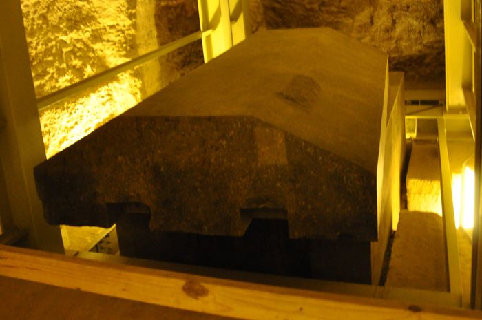 Слева от этой камеры стоял второй базальтовый саркофаг с остатками двух тел, несколькими глиняными и каменными сосудами и золотой чашей.