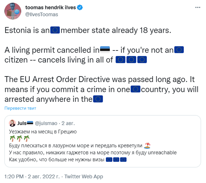 Тем временем, Юлия-айтишница затвитила, что она с семьей уехала отдыхать на месяц в Грецию – что очень удобно, ведь теперь «больше не нужны визы». В ответ на это Тоомас пояснил, что согласно законам Евросоюза (частью которого является Эстония), при совершении преступления в одной стране ЕС – человек может быть вполне успешно арестован в любой другой стране Евросоюза (кстати, Греция тоже там же).