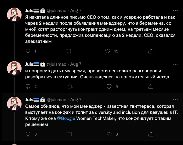Однако, после разразившегося в Твиттере скандала, компания достаточно резко поменяла свою позицию: Юлию уведомили о разрыве контракта с двухнедельной денежной компенсацией. В обосновании для разрыва контракта речи о соцсетях не шло: в вину айтишнице поставили недостаточную коммуникацию с командой, регулярные опоздания на встречи и в целом не очень быстрое и эффективное решение поставленных задач.