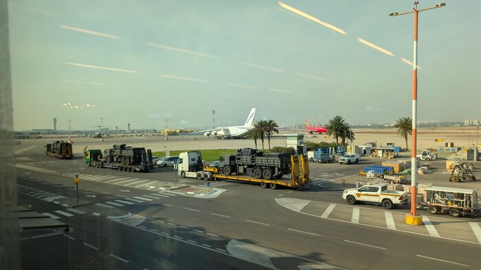 В кадре видно, что в грузовой отсек самолета въезжает военный грузовик. На фото также запечатлены тралы, на которых размещены аналогичные грузовики, направляющиеся в сторону Ан-124.