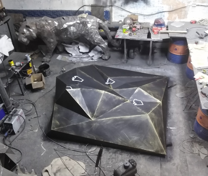 Крепиться к самому железному камню, имитирующему бронзу, конкретно в этом случае лев не будет. Поэтому места соприкосновения лап с основанием будут обработы антигравием. Шоб у ржи вообще соблазна не было, ну и при установке на месте постоянной дислокации сразу будет понятно, куда какую лапку ставить. Хотя все таки есть смысл приварить шпильки, наверно на 16..и прикрутить к херам .. к камню.. Как то так. Полностью готовый лева с камнем, в более приятной обстановке, чем хаос моего цеха будет в моем инст mad_iron_craft