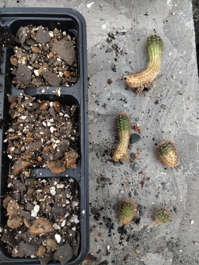 В целом получил около 50-60 деток различной величины. У многих уже есть свои собственные корни. Большие корни я подрезал. Распределил кактусы по размерам как можно равномернее. На каждый грунт 3 ячейки в кассете и горшок 350 мл. Хорошо бы добавить еще большие горшки, например литровые, но их под рукой не было, да и жалко тратить лечузу с серамисом