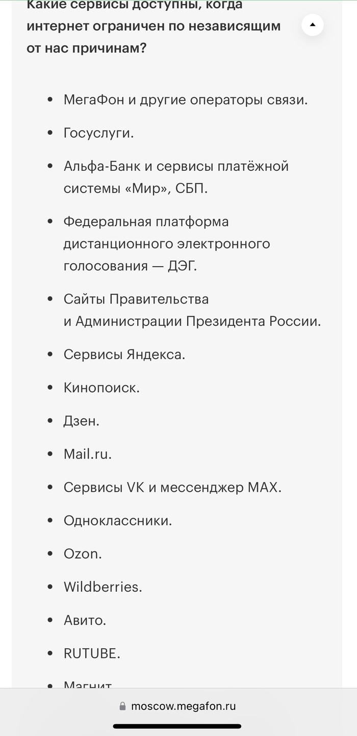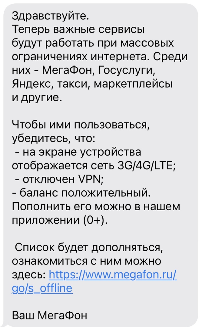 Сегодня мегафон «обрадовал» Дескать, самые важные сайты будут доступны всегда, даже при ограничениях интернета «по независящим от них причинам». Вообще не удивлюсь, если до конца года только эта хуйня и останется доступна(