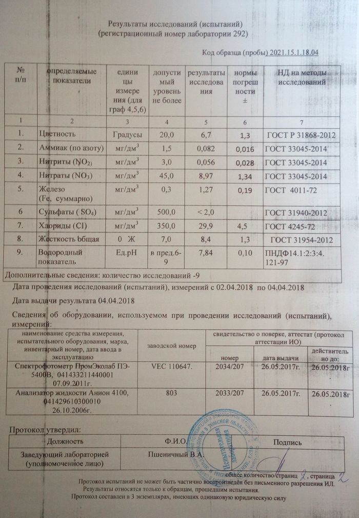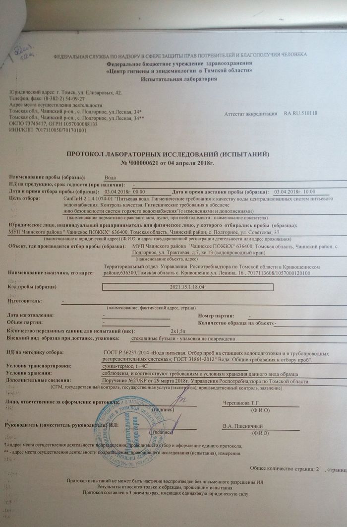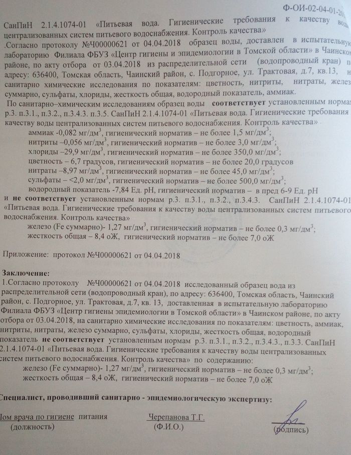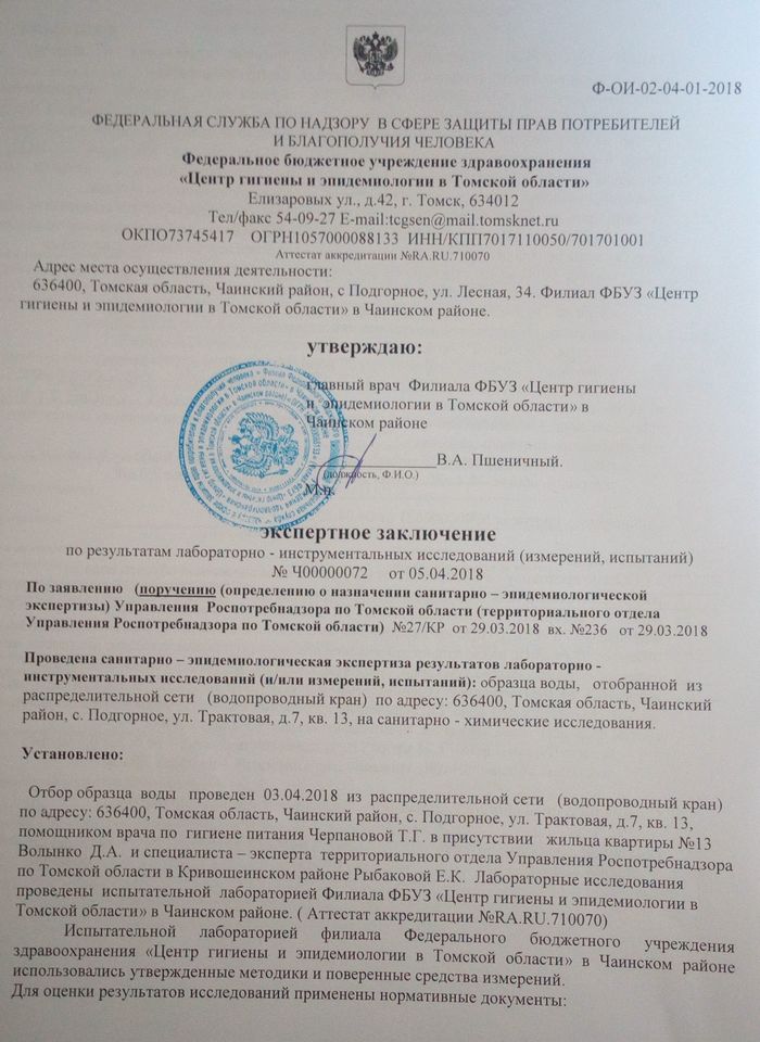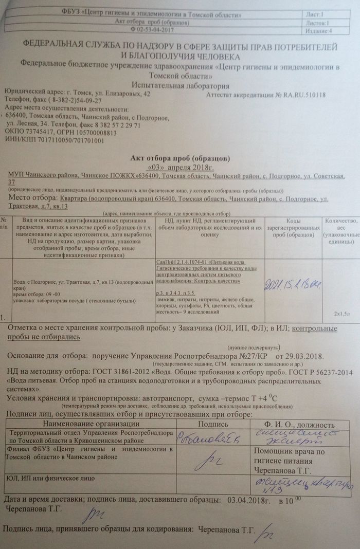 3 апреля 2018 года у меня в квартире была взята проба воды