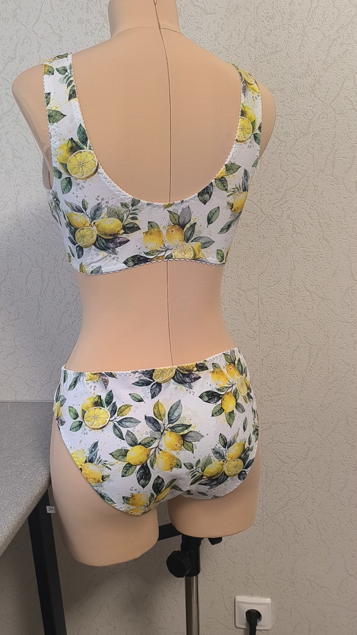Макет не делала, сразу шила готовый комплект. Слипы с удлиненной ластовицей. Передняя часть топа продублирована ещё одним слоем хлопка изнутри.