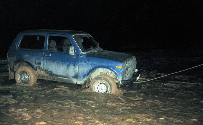 Выехать самостоятельно из грязевого плена нереально. Посему горе-водитель на пару с синим штурманом были посланы на… ближайшую дорогу искать таких же идиотов, которые полезут сюда нас вытягивать. Через полчаса подходящая кандидатура была найдена – мужик на ниве (внедорожник!) приехавший на рыбалку. Мы обрадовались, увидев полноприводный пепелац! Правда кончилось всё тем же – нива застряла в говнах. С той лишь разницей, что в грязи увязли все четыре колеса (полный привод же!) против двух наших :)