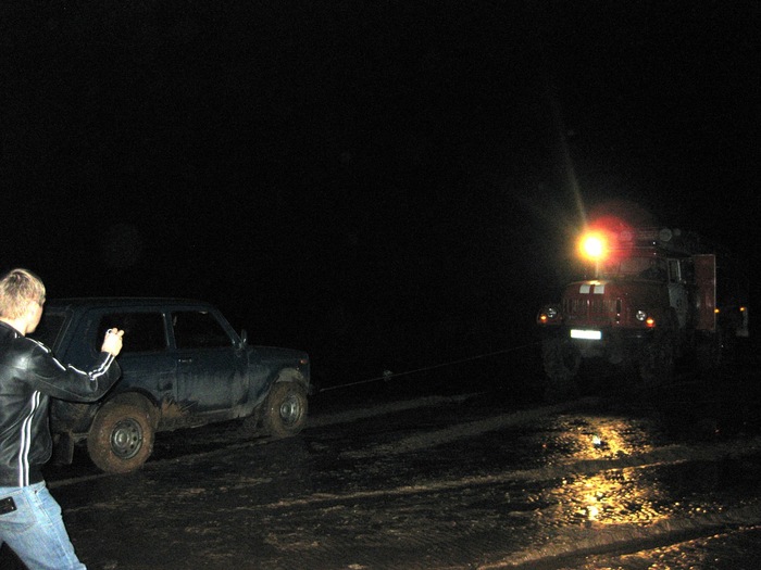Приезжают ребята на Урале. С лёгкостью вытягивают вторую машину и с такой же легкостью вязнут в попытке вытащить первую… Урал пытаются вытащить только что освобождённым газончиком – теперь в гвняном плену 3 машины… Песдец. А как это эффектно смотрелось со стороны: включено море огней, и пара десятков человек бегают вокруг этих махин с тросами, шлангами и чёрт знает ещё с чем, словно муравьи в муравейнике. Залюбуешься!