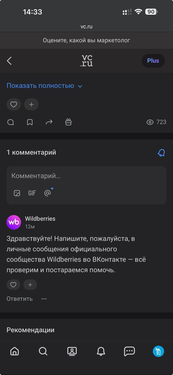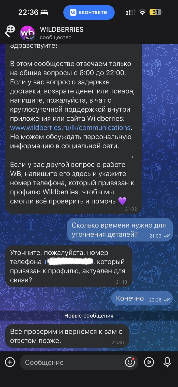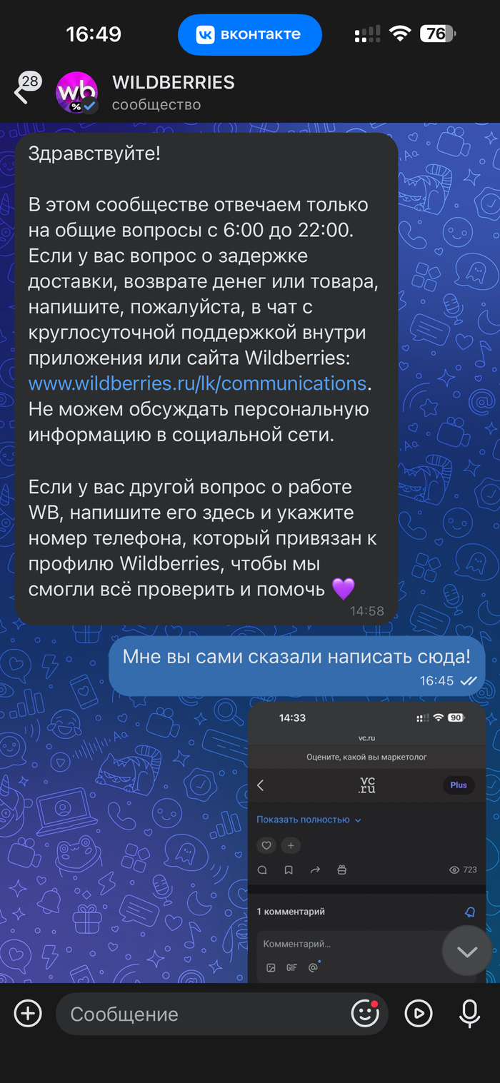 Меня футболили везде, перекидывали от одного к другому, продавец слал в поддержку, поддержка писала бесконечно- ждите! На сайте vc где я также опубликовала пост, ВБ даже мне ответил! Послал писать в ВК 👇