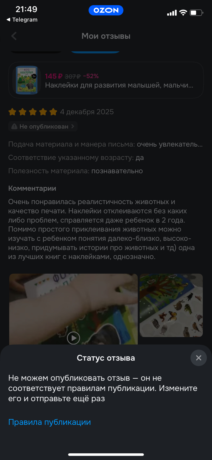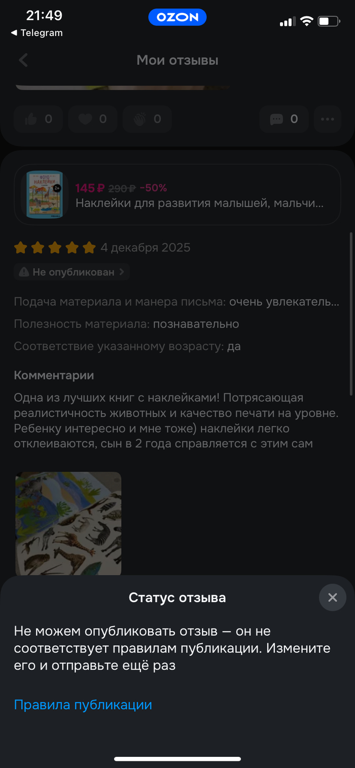 По каким-то неизвестным мне причинам перестали проходить к публикации отзывы, которые я пишу. В первый раз я попыталась написать в поддержку, но со мной даже не связался оператор, пообщалась с ботом и отказалась от идеи что-то выяснять. Но когда сразу несколько отзывов отклонили, я уже не думаю что это простое совпадение. Ранее мои отзывы проходили и публиковались, даже за баллы, что изменилось теперь? Или что не так с отзывами? Я ведь даже не могу узнать что не так и отредактировать. Номер заказа по которому в данный момент не проходят отзывы прикрепляю — 0105159823-0132 от 29 ноября.