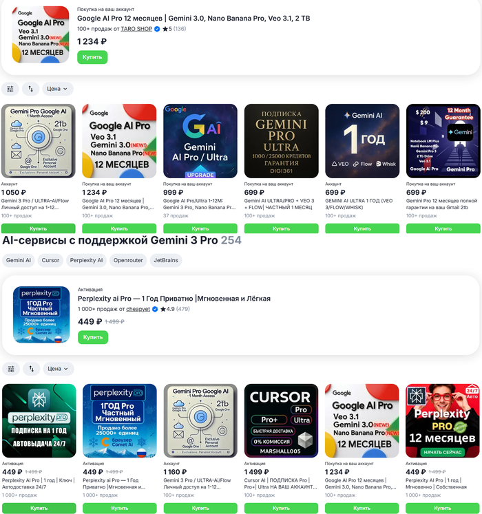 Перейдите на сайт ggsel. Воспользуйте поиском и введите «Gemini». Либо перейдите по этой ссылке, открыв подборку AI-сервисов с поддержкой Gemini 3 Pro: Perplexity, Cursor, JetBrains и другие.