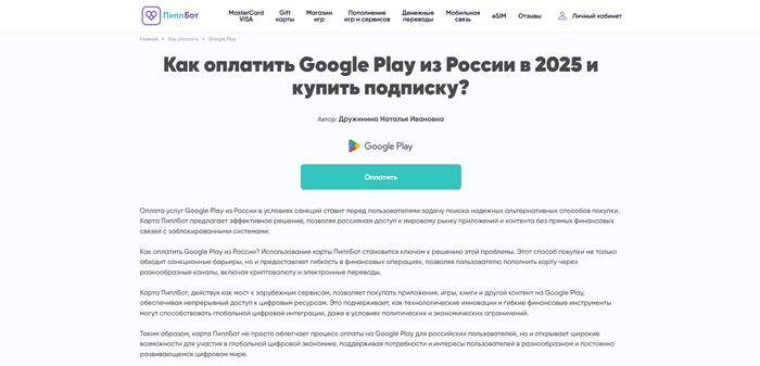 Если вы впервые пытаетесь разобраться, как оплатить Google Play в России 2025, эта инструкция проведёт вас по всем шагам — от выбора сервиса до активации промокода. Следуя описанной схеме, вы сможете безопасно пополнить баланс, оформить подписку или купить любое приложение, используя удобный промокод для оплаты в Гугл Плей 2025.