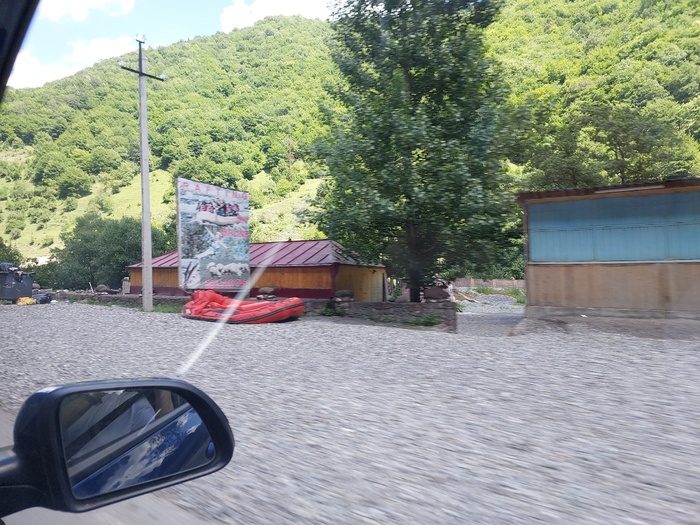 Далее наш путь лежал вдоль горной реки Белая Арагви, на берегу которой каждые несколько километров распалагались базы для рафтинга с надувными лодками и всем необходимым снаряжением.