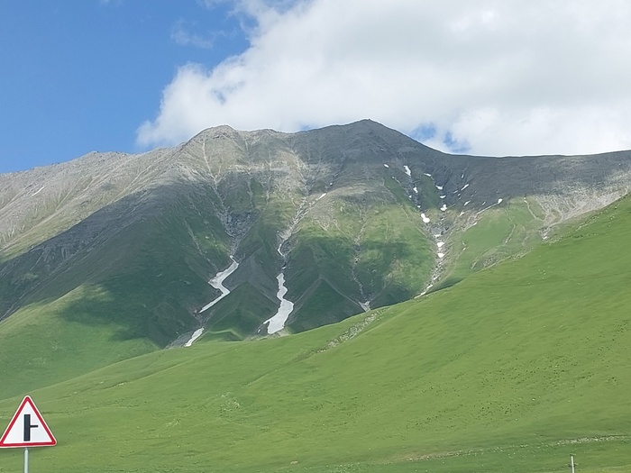 Особенно красиво было возле села Гудаури. Это самый высокогорный населённый пункт на дороге (2150 м над уровнем моря). Там расположен горнолыжный курорт. Расстояние от Тбилиси до Гудаури составляет около 120 км и заняло около 2 часов.