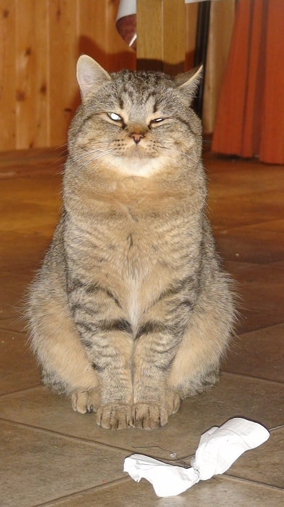 Так пережил он зиму, началась весна, а с ней вместе началась битва за Мордор. Кот стал приходить домой раз в два-три дня, поначалу мы переживали, а потом махнули рукой - он просто бился с другими котами за право наплодить очередную порцию таких же толстомордых котят. Возвращался в коматозном состоянии и падал без чувств отсыпаться, и однажды мы застукали его спящим вот в такой позе: