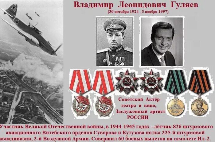 Владимир Гуляев запомнился в роли шофера Юру в картине "Весна на Заречной улице" и шофера же в фильме "Бриллиантовая рука". У него два ордена Красного Знамени и орден Отечественной войны, медали. Владимир – летчик-штурмовик, воевавший на Ил-2.