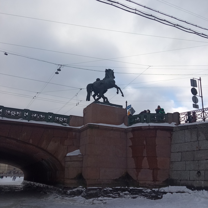Найти спуск на котором я могла бы сойти было не самой простой задачей, в большенстве мест очень высоко спускаться с последнй ступеньки набережной до льда, или там где хотелось бы поставить ногу уже образовалась ледяная горка. Но на мое счастье нашлось место для спуска и я радостно пошла смотреть на лошадок из под моста.