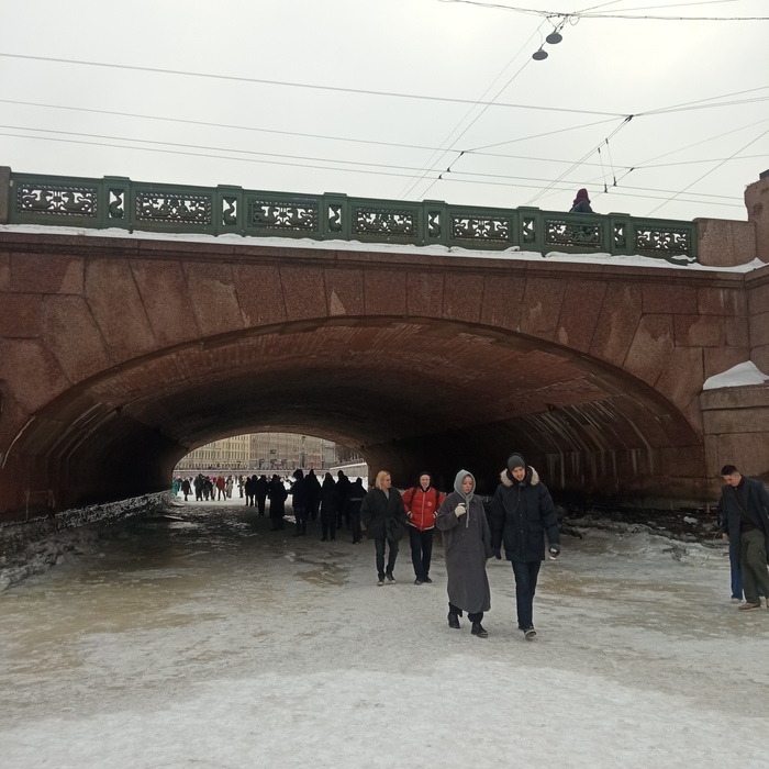 Если вы думаете, что на реке свободно и безлюдно то вы ошибаетесь, там более людно чем на Невском проспекте, все торопятся успеть погулять по замершим рекам и каналам, а на Фонтанке еще и очень красиво. Таким образом на льду оказались дама с картонкой, коробкой, и маленькой сабоченкой, семья с детьми, нет много семей с детьми, лыжники, блогеры которые вели сьемки, катались велосепедисты, а к чижику-пыжику собралась очередь.