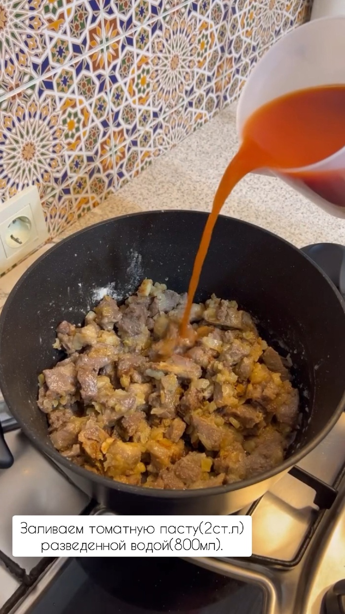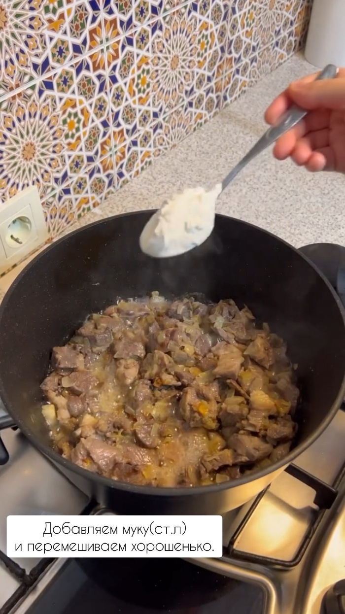 Когда половина пива выкипит, добавить бульон. Убавить «огонь» и тушить минут 30. Далее добавить муку. Можно не всю, но что бы достигнуть нужной густоты. Хорошо размешать!