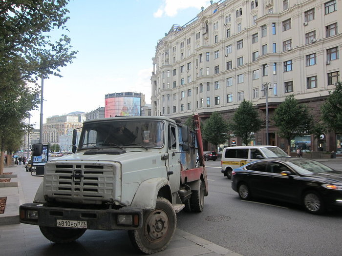 Москва, Тверская. Мусоровоз ЗИЛ заезжает в арку