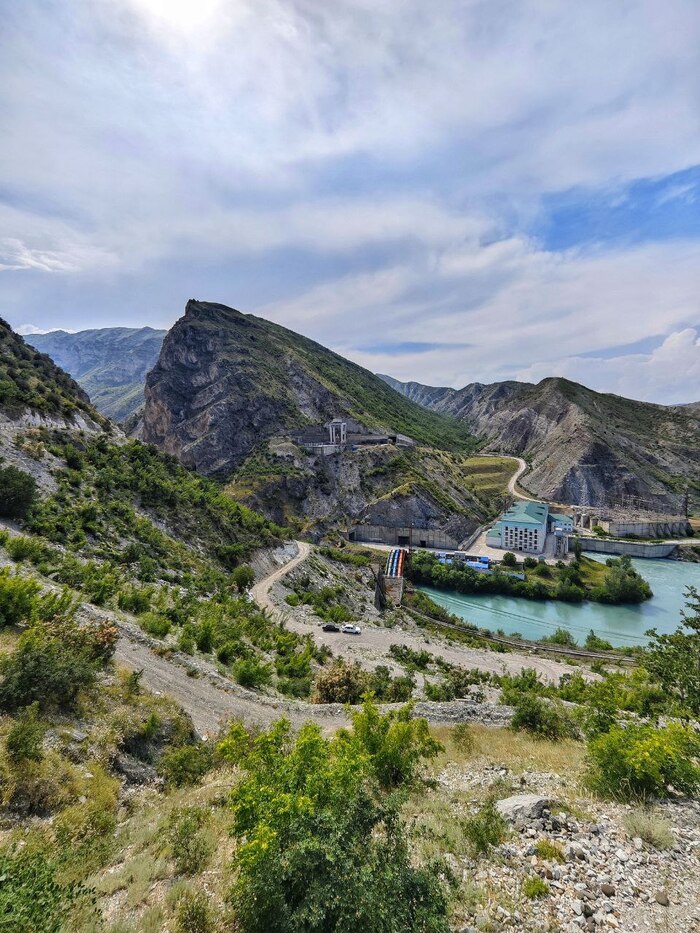 Итак, до Гамсутля 30 км, и мы бодро шагаем по дороге в его направлении. По пути мы зашли на плотину Гунибской ГЭС. Нечасто бываешь на таких сооружениях и крайне необычно видеть воду почти по уровню дороги с одной стороны и 70-метровый обрыв с другой. Сфоткались на фоне окружающих пейзажей и с местным котом, затем вдоль водохранилища продолжили наш путь.