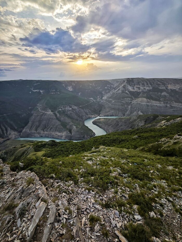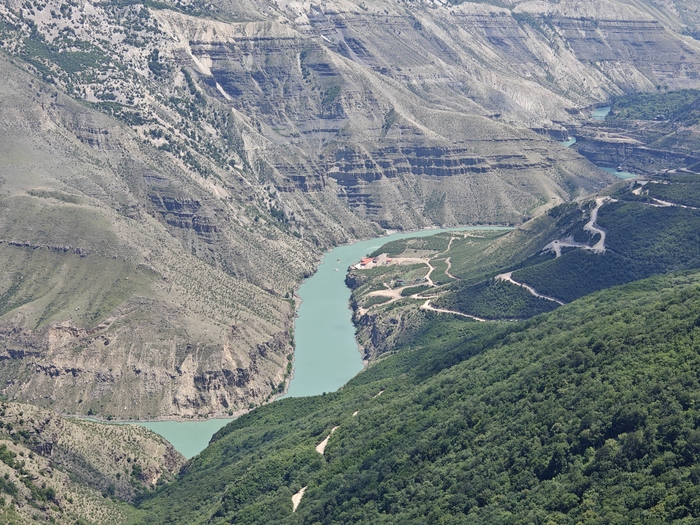 Если бы мы поехали прямо, то дорога привела нас в Гуниб. Сейчас я жалею, что мы построили свой маршрут мимо, хотя до него оставалось каких-то 4 км. Селение, расположенное на склоне горы, с богатой историей, и красивейшими видами. Это я уже потом при подробном рассмотрении карты увидел, что можно было после посещения Гамсутля зайти в Гуниб, провести остаток дня рассматривая его окрестности, переночевать на одном из живописных склонов и на следующий день пешком пройти около 20 км по Царской тропе и через Гунибский тоннель до следующей точки нашего маршрута – Карадахской теснины. Склоны в прямом смысле живописные, так как Айвазовский, прославившийся как художник-маринист написал очень мало картин не на морскую тематику и целых две из них – с видами Гуниба. Так что, если вы это читаете и планируете маршрут по Дагестану, то обязательно проложите его через Гуниб.