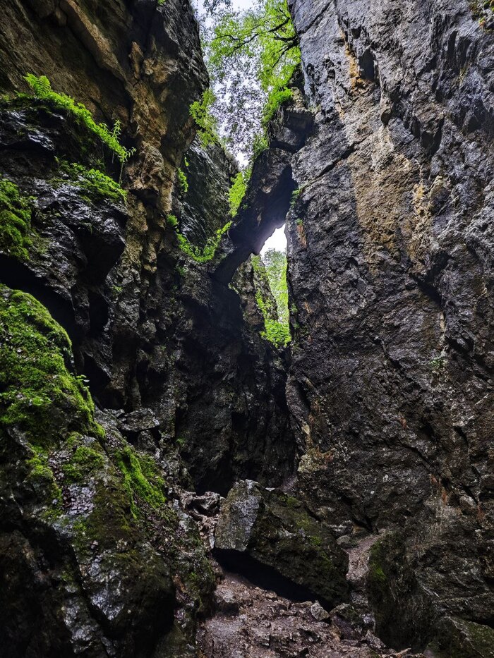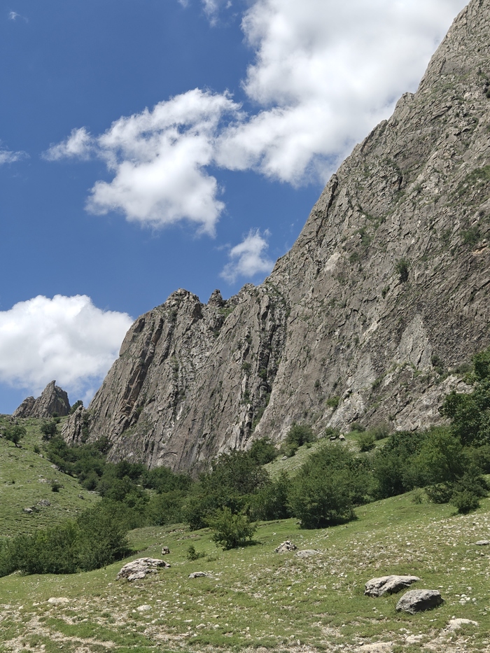 Могучие скалы нависали над нашими головами и в одной из них четко прослеживались очертания задравшегося края тектонической плиты. Как я заметил чуть позже, в этой местности много таких гор, которые кажутся вылезшими из земли совсем недавно – у них отчетливо виден торец плиты и плоская часть, бывшая некогда равниной.