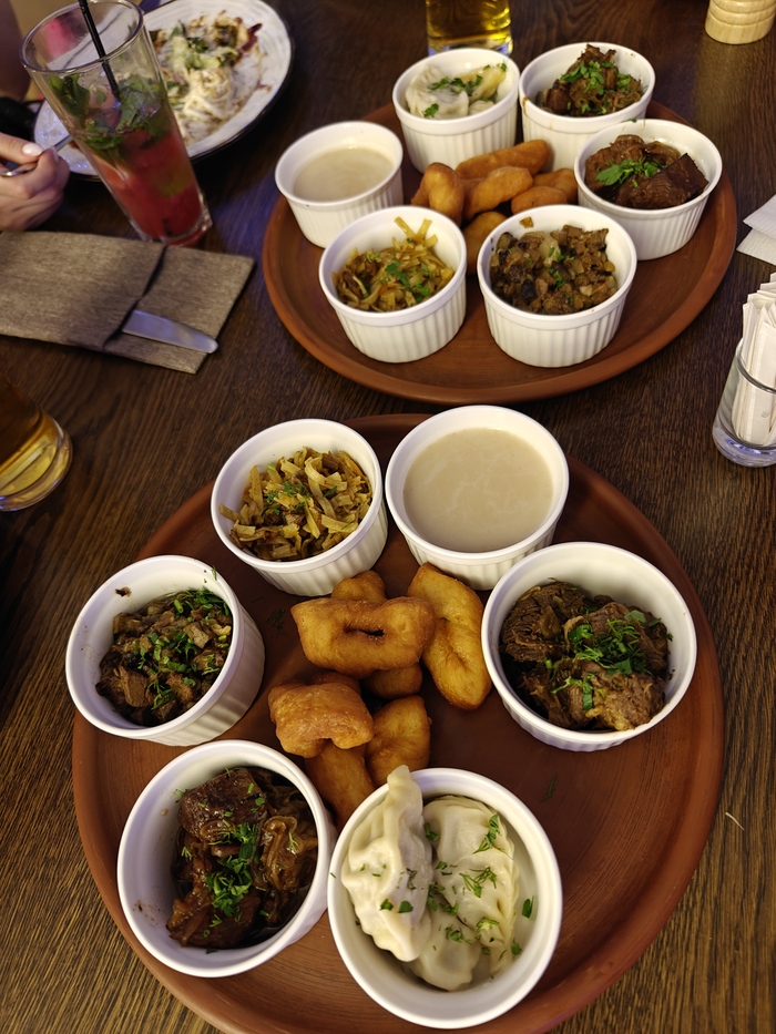 Дальше мы опробовали местную кухню и посмотрели на национальные танцы! Очень круто! Попробовали мясо яка, марала, верблюда, местную лапшу, потроха, пельмешки. Мой личный фаворит - як, очень нежное и вкусное мясо. На втором месте - верблюд. Калмыцкий чай «джомба» вещь очень странная - соленый чай с молоком, но какой-то прикол в этом есть.