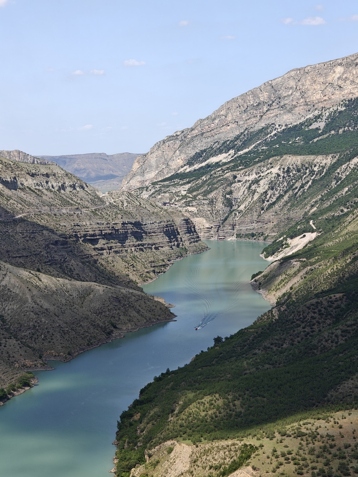Спустившись к кафешке, в которой мы оставили наши рюкзаки, набрали там воды и вышли в обратный путь – Гамсутль был тупиковой веткой нашего маршрута, и нам предстояло вернуться к Гунибской ГЭС, чтобы от нее пойти к Карадахской теснине. Пройдя пару километров вверх по дороге, мы словили машину с семейной парой. Они были из другой части Дагестана, сюда приехали посмотреть на разрекламированное заброшенное селение и сейчас направлялись в Гуниб. На заднем сидении лежал пакет со сливами. Усаживаясь и перекладывая его на заднюю полку, мы сказали, что тут сливы и тут же услышали «Это вам!». Мы попробовали возразить, но тут же поняли, что без слив из машины нам не выйти. Разговорившись с водителем и его женой, мы выразили свое удивление тем фактом, что хоть они и почти местные, но все равно путешествуют по Дагестану. Нам уже много кто говорил, что когда ты вырос в этих краях, то все эти виды и красоты становятся обыденными и особого желания ездить рассматривать такие же горы, но с другого ракурса, нет. Оказалось, что не все такие и, в частности они, довольно часто выезжают покататься по разным уголкам Дагестана.