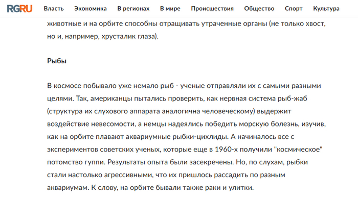 Скриншот с одного из многих сайтов, где пишут про гуппи - первых рыб в космосе