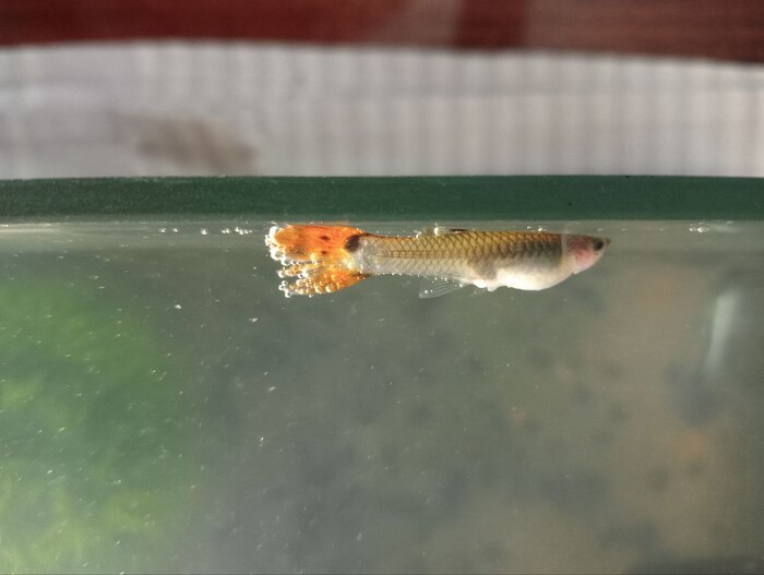 У гуппи на хвосте какое-то объёмное пятно жёлтое появилось. По ощущениям будто внутри хвоста как киста. Аквариум на 75 литров, корм гск, подмены раз в неделю 30-40%, население креветосы, 5 неонов, 3 корридороса, 2 анцика, 4 гуппи, 2 сомика червяка.