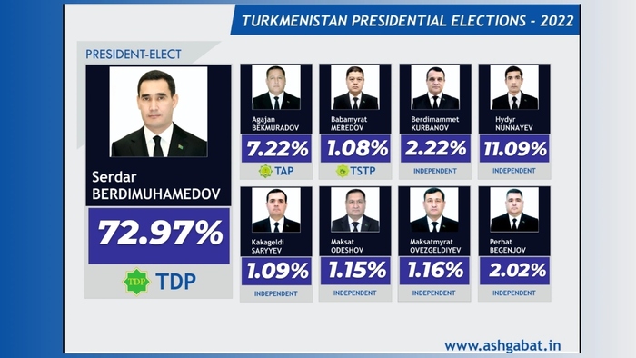"В соответствии со ст. 76 Избирательного кодекса Туркменистана и на основании постановления Центральной избирательной комиссии от 14 марта 2022 года, заместитель председателя кабинета министров Туркменистана Сердар Гурбангулыевич Бердымухамедов, набравший 72,97% голосов избирателей, признан избранным президентом Туркменистана", - говорится в сообщении, опубликованном на сайте избиркома.