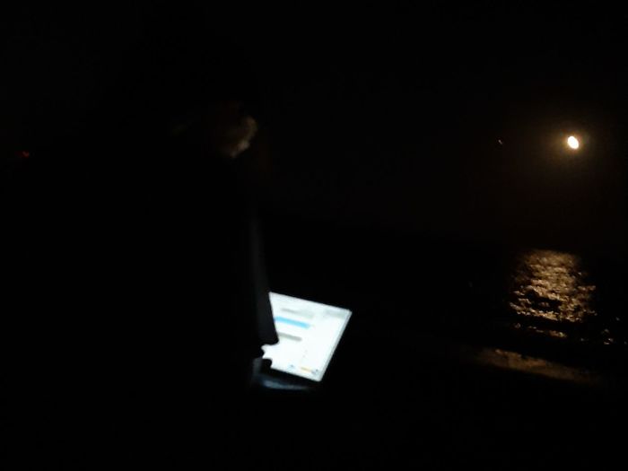 Мы встретились с Владом, доехали на скутере до дачного участка (никогда не каталась ни на чем электронно-двухколесном!) и отправились на берег моря. Это был один из самых классных рабочих вечеров, может, самый классный. Галька, море, лунная дорожка, звезды и шаурма. Жаль, что ноут разрядился быстро. Фото ниже плохое, но может быть, хоть чуть чуть поможет проникнуться атмосферой.