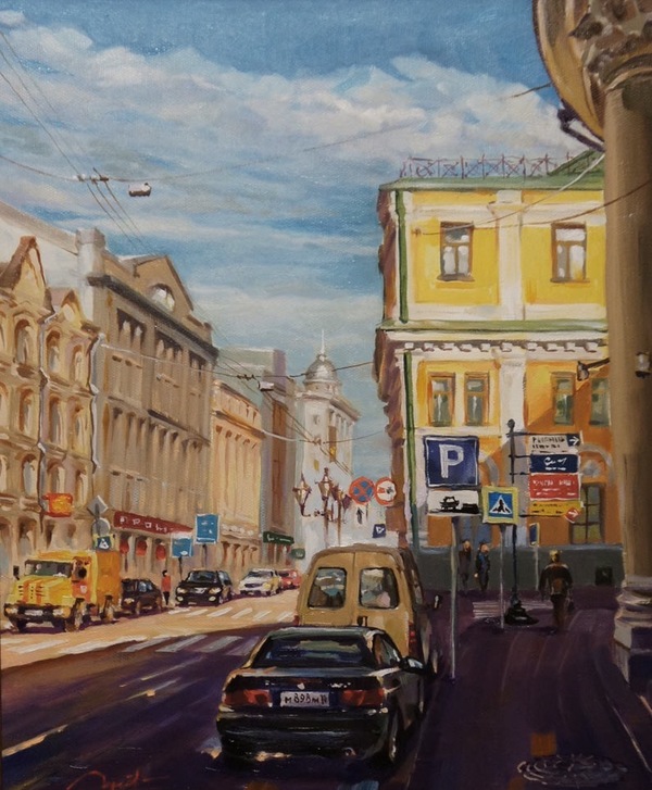 Мало пожалуй известен, но все же замечательный художник Евгений Гусев. Член Союза художников Подмосковья. Занимается иллюстрациями для книг и комиксами. Его картины удивительно передают современную Москву, но немного другим завораживающим повседневством города взглядом. Когда простые, как кажется затертые уже здания, машины, трамваи и дороги становятся такими родными и такими близкими.