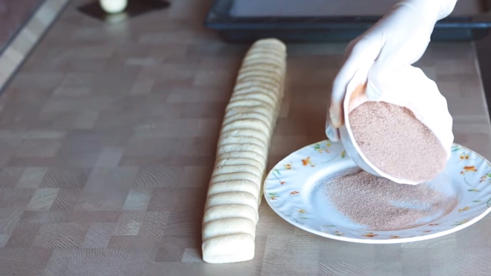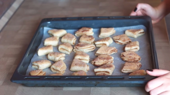 Каждую заготовку обмакнуть в смеси сахара с корицей. Сложить дважды пополам, чтобы получились треугольники.