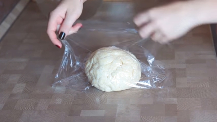 Всё хорошо перемешать до соединения всех продуктов. Собрать тесто в комок, завернуть в кулёк или пищевую плёнку и положить в холодильник, для охлаждения, на 30 минут.
