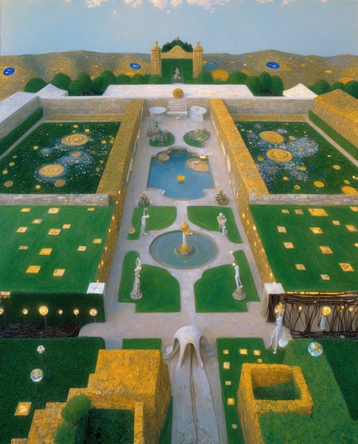 В композиции переплетаются геометрические орнаменты, мотивы глаз, лабиринты, древние символы — всё это создает впечатление иконоподобного образа, почти сакрального.