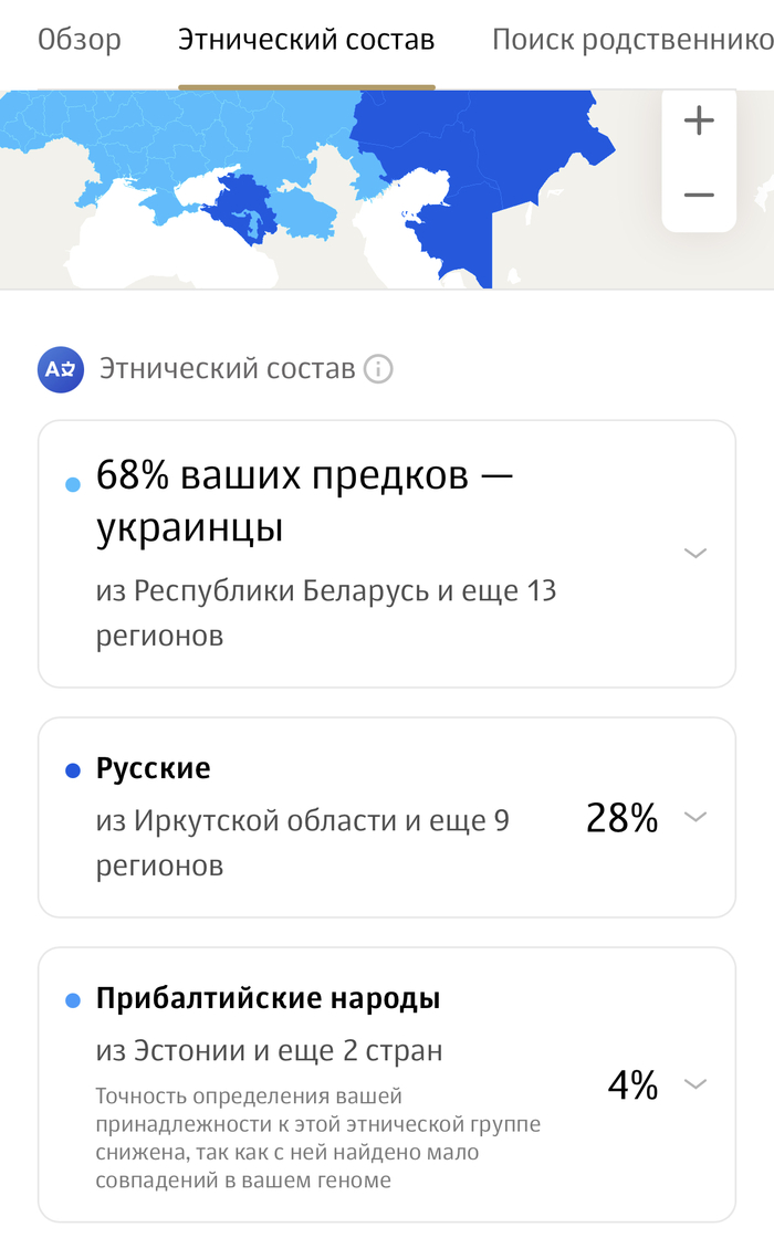 Вообще не стоит относиться к процентам слишком серьёзно: когда речь идёт о происхождении, вас в первую очередь развлекают, а не дают стопроцентные цифры. Это может быть весело и интересно, но не стоит заявлять, что вы больший еврей, чем ваш друг Вася — потому что «генетика так сказала». Это так не работает. Более того, есть люди, которые проходили тесты в разных компаниях — и получали по итогу разные результаты. Так, мужчина по имени Алексей Гончаров сдал свою ДНК в 12 разных местах — и все результаты его происхождения отличались друг от друга.