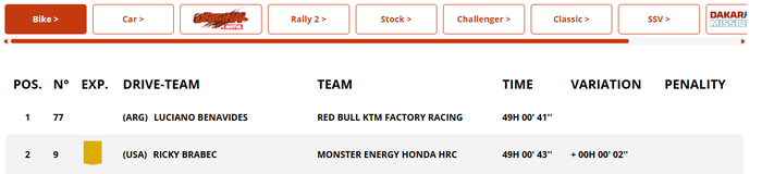 Лидер общего зачёта Рики Брабек (США) из «Honda HRC Team», открывавший сегодняшний спецучасток, заблудился на заключительных 19 км этапа и проиграл гонку пилоту KTM Лусиану Бенавидесу (Арг)