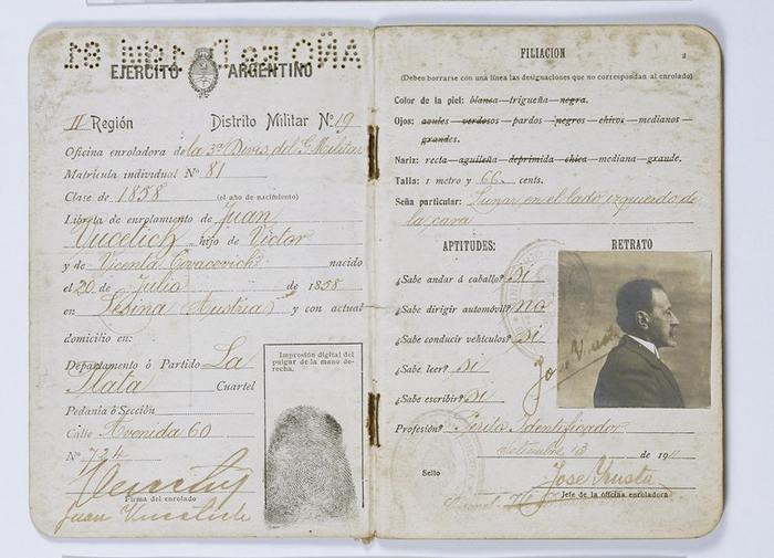 Персональная карта Вучетича с отпечатками пальцев, 1911 год. Источник: Полицейский музей Министерства безопасности провинции Буэнос-Айрес, Аргентина.