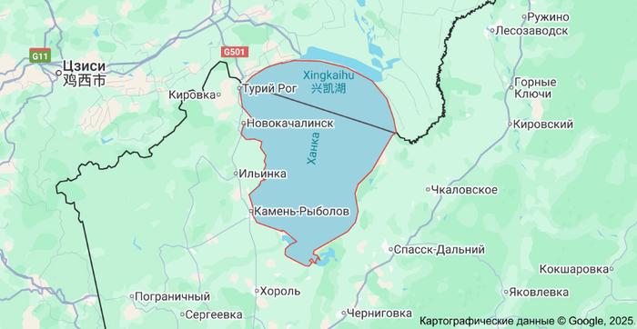Длина озера при среднем многолетнем уровне равна 90 км, наибольшая ширина – 67 км. и это делает Ханку крупнейшим пресноводным водоемом не только Примрья, но и всего Дальнего Востока. На западном берегу озера, у границы с Китаем находится старейшее в Приморье российское поселение поселок Турий Рог (1858).
