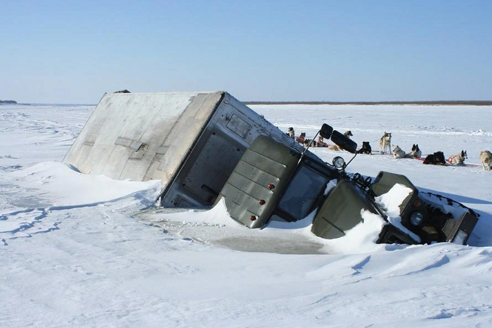 Попал в нее и нету машины. «Урал» он и порожний 9 тон весит, а мы ж его под завязку нагружаем. Помимо товара, пища, топливо, запчасти. Выгружаем аврально и тянем. А если не успели, то вырубаем изо льда.