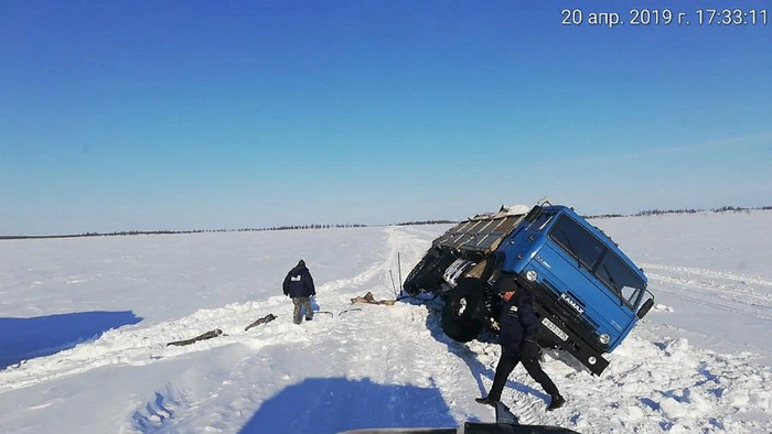 Наледь. Это вода, которая выступает на поверхность льда из-за трещин под давлением и тут же замерзает тонкой коркой, создавая под собой водяную линзу. Тяжелый грузовик легко проламывает верхнюю корку и мгновенно вязнет.