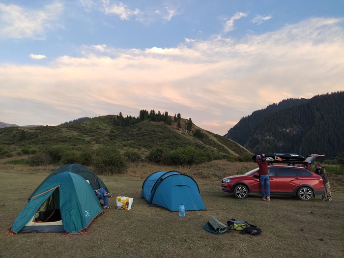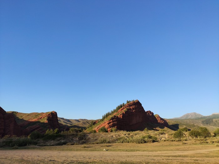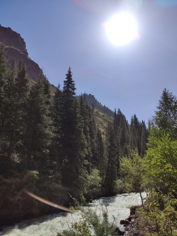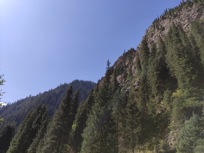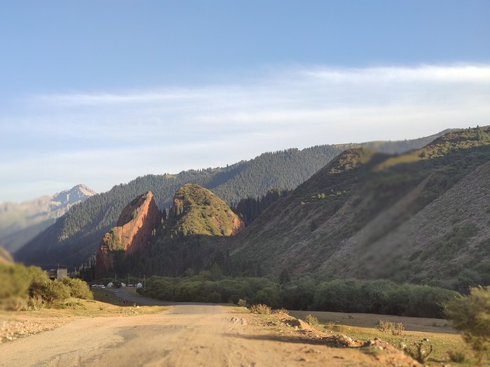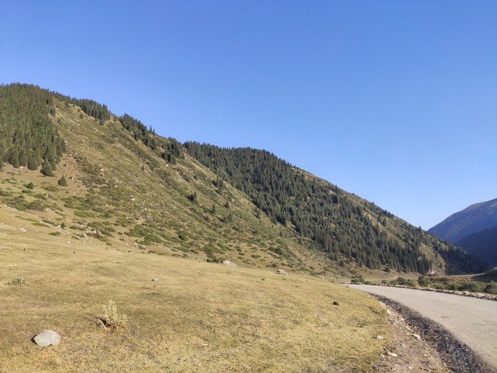 Еду в вечерней прохладе и наслаждаюсь. Трасса на Иссыкуль проходит через ущелье в горах. Это четырех полосная, идеально гладкая дорога, которая неспеша петляет между величественных склонов. Если есть в мире счастье, то это ехать на мотоцикле по такой дороге. Да, это действительно дарит чувство полета и свободы. Запах хвои на склонах, прохладный ветерок, практически ответные скалы, это невозможно описать, только почувствовать. Чистейшее, концентрирование счастье в идеальном моменте, который длится километр за километром. Впервые за весь путь я пожалел что еду один, так хотелось разделить это миг с кем то близким. Даже на романтику потянуло.