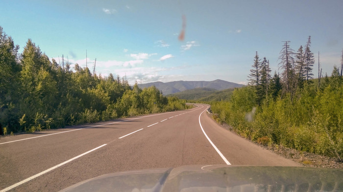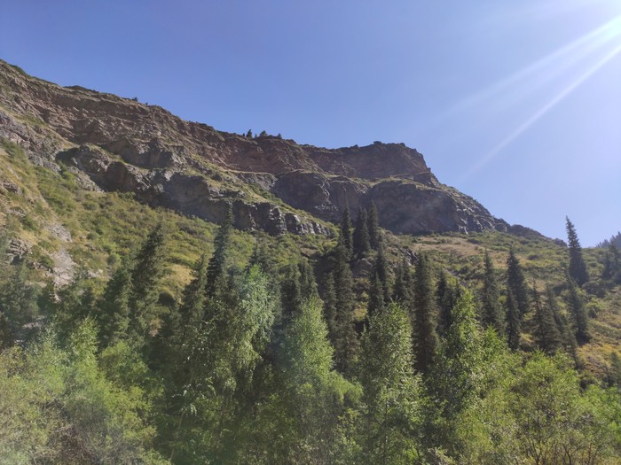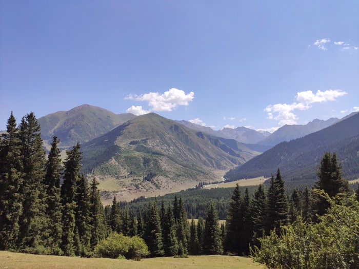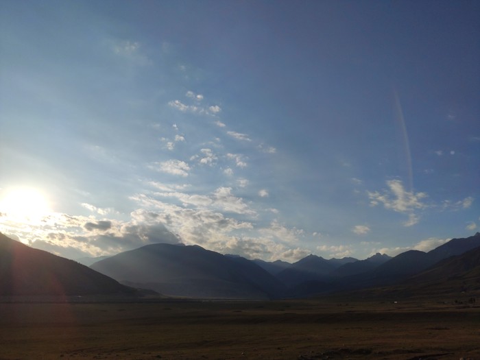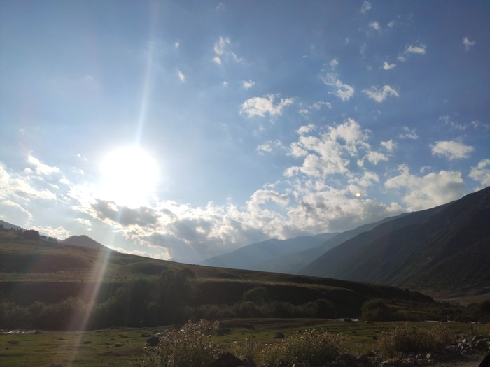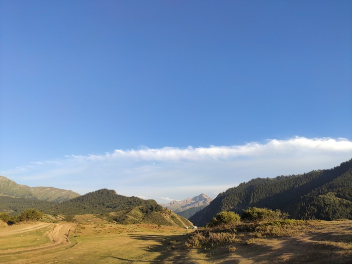 В целом нечего интересного за день не произошло. Перекусы в придорожных кафе, заправки топливом странного цвета, бесконечно депрессивный пейзаж. На подъездах к Алма-Ата стали замечать что появляются небольшие холмы и дорога постепенно перестает быть томной. Появляются редкие деревья, но при этом стало ещё жарче. Поднимаясь на очередной холм увидел в дали линию белый облаков. Что-то с ними не так, но я не могу понять что, и лишь заехав на очередной подъем я понимаю что это не облака а снежные вершины которые так далеко, что я не вижу основания гор, но вижу снежные вершины. Эта одна из прекрасных и удивительных картин что я видел в жизни. Простите, но остановится и сделать фотографию я не догадался, слишком сильно это заворажило меня. И внезапно стало совсем легко ехать, теперь я видел для чего весь этот путь. Вот она моя цель, совсем рядом и она прекрасней чем в моих мечтах.