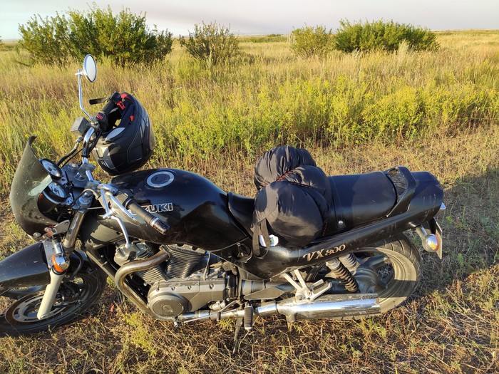 Объясню на пальцах- по средством резинки и мата примастрячил на сиденье свой спальник. Ехать стало действительно в разы комфортнее, но при этом я улетел с седла ещё до того как выехал с грунтовки на трассу. Не делайте так как я, сию конструкцию пришлось уничтожить и ехать как задумывалось инженерами Сузуки.