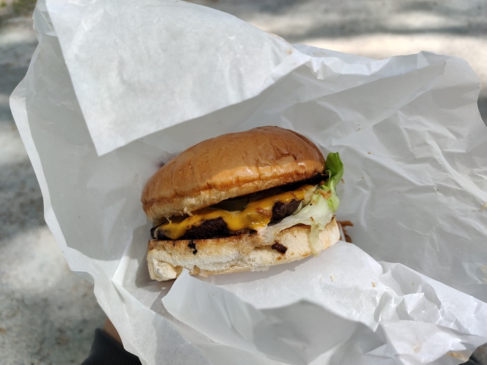 Двинули по Богдашке к ЛДС, вкусить бургеров у которых стоит золотая звезда 2гис. Примчали, заказал 2 с мраморной говядиной, салатом айсберг, халапенью, хрустящим карамелизованным луком и чем то там ещё.
