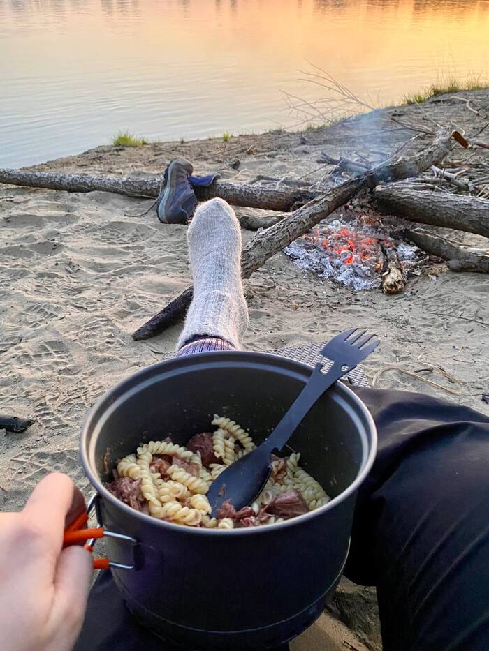 Разрулив ситуэйшн, мы поставили палатку, откупорили бутылочку "Лыхны", приготовили вкусный ужин и принялись наконец то отмечать поездку 🤤