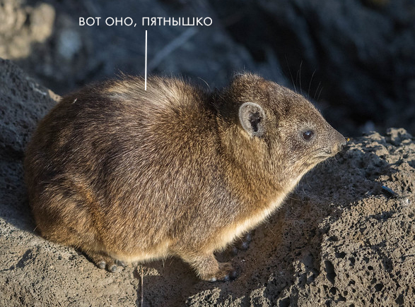 Как и многие другие животные, даманы обладают особыми пахучими железами, которые выполняют функцию маркера территории, а также служат для передачи информации об обладателе этих желез, вплоть до гормонального состояния на сегодняшний день. Так вот, если у привычных нам кошек и собак пахучие параанальные железы расположены под хвостом в районе заднего прохода (вот почему зверье нюхает друг друга там при знакомстве), то у самцов дамана они открываются на спине. Причем они даже выделены контрастным цветом шерсти.